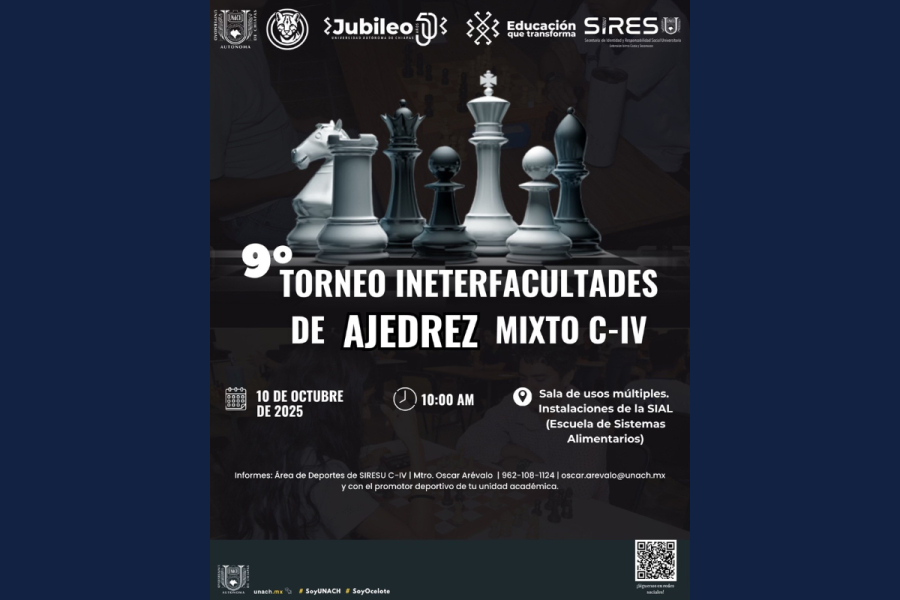 La Benemérita Universidad Autónoma de Chiapas (UNACH), a través de la Secretaría de Identidad y Responsabilidad Social Universitaria (SIRESU), en coordinación con la Extensión SIRESU Istmo-Costa y Soconusco, invita a la comunidad universitaria al 8º Torneo Interfacultades de Ajedrez Mixto C-IV.