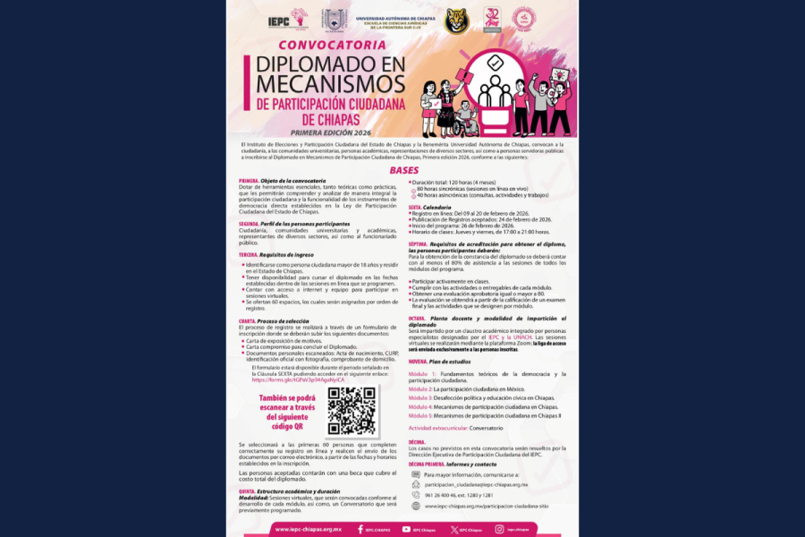El Instituto de Elecciones y Participación Ciudadana del Estado de Chiapas (IEPC) y la Benemérita Universidad Autónoma de Chiapas (UNACH) lanzan la convocatoria para la primera edición 2026 del Diplomado en Mecanismos de Participación Ciudadana de Chiapas, dirigido a ciudadanía en general, comunidades universitarias, académicos, representantes de diversos sectores y servidores públicos.