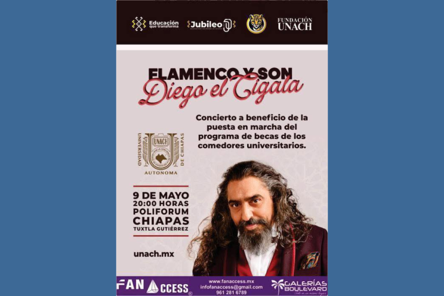 La Universidad Autónoma de Chiapas (UNACH) invita a la comunidad universitaria y al público general al concierto Flamencoxson, protagonizado por el artista Diego el Cigala. El evento se llevará a cabo el 9 de mayo de 2025 a las 20:00 horas en el Poliforum Chiapas de Tuxtla Gutiérrez, con el objetivo de recaudar fondos para el programa de becas de comedores universitarios.