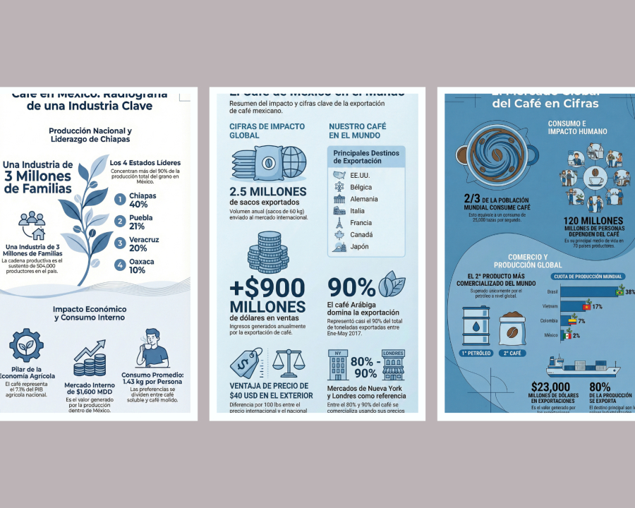 En el ámbito nacional, Chiapas aporta aproximadamente el 40 por ciento de la producción cafetalera, seguido por estados como Puebla, Veracruz y Oaxaca. La mayor parte del café producido corresponde a variedades arábigas de altura, reconocidas por su calidad en los mercados internacionales. Sin embargo, el precio pagado al productor en el mercado interno suele ser inferior al internacional, lo que incentiva la exportación como principal vía de comercialización y reduce las posibilidades de fortalecer el consumo local.