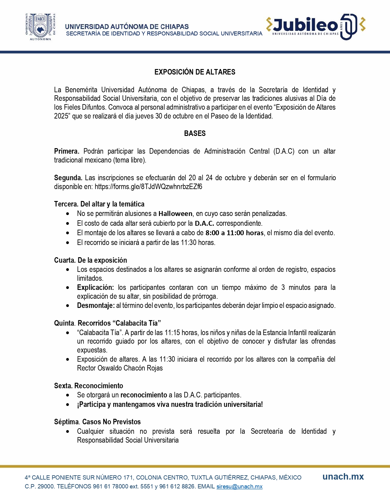 Con el propósito de preservar las tradiciones que dan sentido a nuestra cultura y fortalecer el orgullo de pertenecer a la Benemérita Universidad Autónoma de Chiapas (UNACH), la Secretaría de Identidad y Responsabilidad Social Universitaria invita a toda la comunidad a participar en la Exposición de Altares 2025, programada para el 30 de octubre de 2025 en el Paseo de la Identidad.